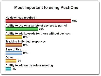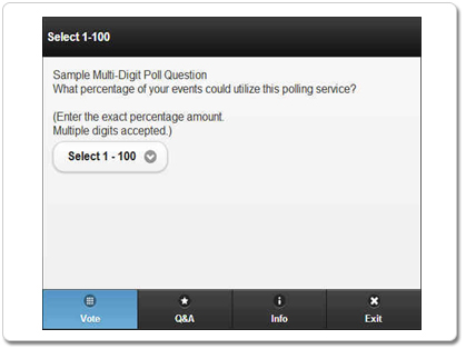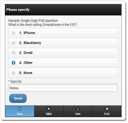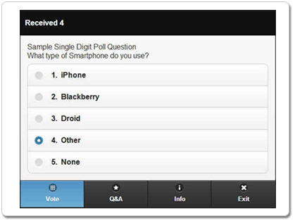 Single-digit polling for questions that you want the audi-ence to select one choice from up to 10 choices. Text of the question is pushed to the device and when you touch or click your choice, receipt of the response is confirmed at the top.