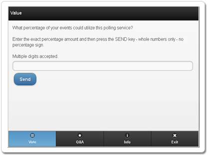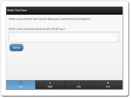 Alphanumeric text polls are available to get feed-back on a more individual level with full text entry. These can be short or long answers accommodating up to 1000 characters. You touch or click the text entry box to input a response and then press the SEND key. Your response is confirmed at the top.