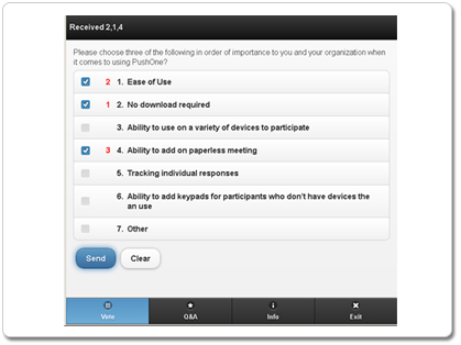 Text of the question is pushed to the device and when you touch or click your choice, it indicates the order each item was selected. When you press the SEND key, receipt of the response is confirmed at the top.