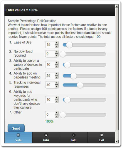 Percentage polling is available for questions that you want the audience to provide a per-centage for each item. The total selected must equal 100%.